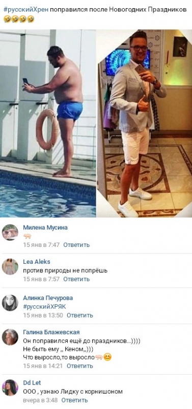 Первые сплетни о том, что мужчина снова значительно поправился, возникли после фотоснимков, размещенных в Интернете Кристиной Дерябиной. Но сам парень тогда все же сумел оправдаться, сославшись на не слишком удачный ракурс. Но сейчас у бывшего участника телестройки уже почти нет шансов опять обмануть окружающих.