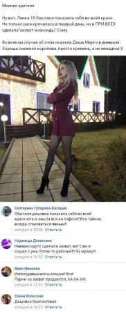 Но почти никто не мог себе представить, что Лена, которой, как оказалось, нравится играть роль роковой разлучницы, опустится до такой степени. Выяснилось, что Хромина не только без всякого смущения позволила себе сексуальный контакт с уже занятым товарищем по периметру за сумму всего лишь в 10 долларов, но и с легкостью выполнила «захват анаконды» в присутствии потрясенных ее поведением Дарьи Лымарь и Иосифа Оганесяна.