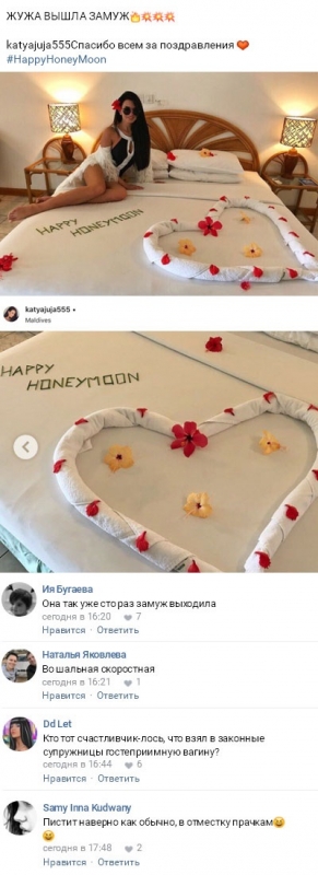 Однако мало кто представлял себе, что взаимоотношения Жужи и ее нового друга, которого Екатерина все еще скрывает от общественности, являются настолько близкими и серьезными. Для поклонников оказалась подлинным сюрпризом фотография Кати, сделанная в номере для новобрачных в гостинице на Мальдивских островах. Но порадоваться за Жужу и поздравить ее со столь важной и значимой переменой в жизни оказались готовы отнюдь не все.