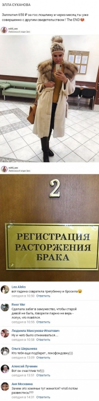 Элла разместила в Интернете снимок, сделанный в ЗАГСе непосредственно возле двери с табличкой «Регистрация расторжения брака». К тому же совершенно недвусмысленно прозвучало и ее сообщение о том, что она уже заплатила 650 рублей в качестве государственной пошлины и по прошествии всего лишь одного месяца вновь начнет жизнь сначала, тогда как Игорь пока никак не разъяснил ситуацию.