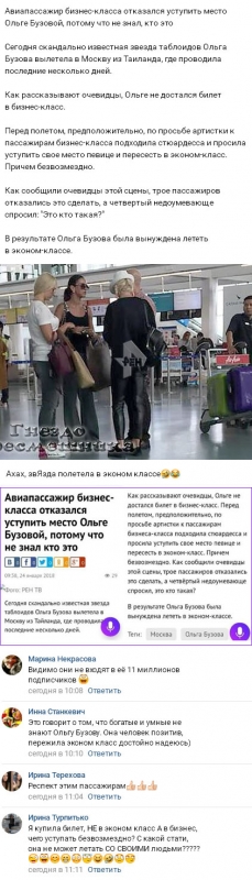 24 января 2018 года телеведущая Ольга Бузова снова предстала перед окружающими в самом невыгодном свете, что случается с нею уже отнюдь не в первый раз, причем на этот раз все произошло в аэропорту. Посетители социальных сетей едва успели опомниться после созерцания весьма некрасивой и непристойной фотосессии Ольги, сделанной во время пребывания ее в состоянии глубокого алкогольного опьянения и выложенной в виртуальное пространство лицами, находившимися на отдыхе в Таиланде, как молодая женщина опять оказалась объектом многочисленных издевательских насмешек. Смотрите также: дом2 вечерний ночной Неприятная история случилась в самолете, на котором Бузова возвращалась в Москву после таиландских каникул. Как утверждают очевидцы, для женщины не оказалось свободного места в бизнес-классе, в результате чего стюардессе пришлось просить других пассажиров уступить место популярной исполнительнице. Но среди этих людей не оказалось ни единого желающего пожертвовать собственными удобствами и комфортом. К тому же один из лиц, к которым была вынуждена обратиться стюардесса, просто не представлял себе, о ком говорит сотрудница авиакомпании. Теперь многих поклонников телеведущей весьма интересует то, как проходил ее полет домой, ведь Ольге все же довелось путешествовать в эконом-классе. Свое мнение о ситуации, в которой оказалась Ольга Бузова, вы можете высказать в комментариях.