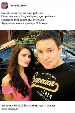 30 января 2018 года поклонники телешоу были искренне возбуждены последними новостями, поступившими со стороны Андрея Чуева и его совсем юной жены Виктории, которой едва исполнилось 19 лет. Фанаты телестройки до последнего не желали верить в бракосочетание Чуева и 19-летней Виктории Морозовой, родившейся в Украине. Многие полагали, что этот союз является исключительно фиктивным, и каждый из двоих преследует собственные цели, объявляя окружающим о браке. Окружающие считали, что Андрей стремится лишь вывести из себя Марину Африкантову, тогда как Вика желает обязательно стать гражданкой России. Смотрите также: дом 2 дневной вечерний ночной за февраль Однако уверенность телезрителей несколько поколебалась после того как эта пара выступила в телепередаче Дмитрия Шепелева «На самом деле». Именно в этот момент многие поверили, что девушка по-настоящему неравнодушна к Чуеву. В то же время и сам бывший участник телестройки вел себя по отношению к Виктории как действительно влюбленный в нее мужчина. Окончательно все прояснило известие, которое эти двое охотно сообщили подписчикам. Оказалось, что Андрей и Вика уже ожидают рождения их первого малыша. Правда, еще не объявлен точный срок беременности молодой женщины и приблизительная дата родов. Стоит вспомнить, что Чуеву предстоит появление уже второго ребенка, от первого брака у него растет дочь по имени Лиза. Свое мнение о том, рады ли вы за Викторию и Андрея Чуева, которые в скором времени станут родителями, вы можете высказать в комментариях.