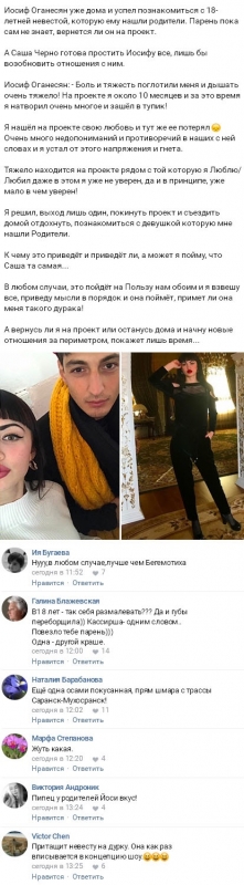 Впечатление от фотографии и мнение о том, действительно ли Иосифу Оганесяну стоит окончательно распрощаться с Александрой Черно и завязать новые отношения с избранной его родителями претенденткой, вы можете изложить в комментариях.