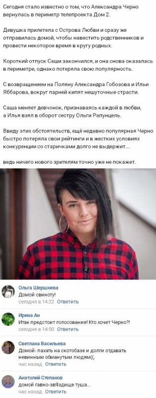 8 февраля 2018 года стало ясно, что Александра Черно находится под угрозой изгнания с телестройки из-за возвращения на телепрограмму Александра Гобозова. На протяжении последнего времени рейтинги этой девушки, испытывающей серьезное и сильное чувство к Иосифу Оганесяну, существенно повысились. За весьма незначительный срок эти двое успели полностью рассориться, распрощаться, затем почти помириться, предпринять еще одну попытку создать гармоничную пару и снова расстаться. Смотрите также: вечерний выпуск дом 2 11/02/2018 Всем уже известно о том, что молодой человек оставил реалити-шоу, поскольку его родители подобрали для него невесту, которая, по их мнению, подходит ему значительно больше, чем Саша. Еще неясно, вернется ли впоследствии Иосиф на телепередачу. Что касается Александры, то она после прибытия с Острова любви отправилась в кратковременный отпуск и уже вернулась на Поляну, однако, скорее всего, девушке не удастся задержаться там надолго. Фанаты телепроекта заметили, что все эфирное время теперь отдается Александру Гобозову и Илье Яббарову. При этом на фоне Гобозова и его бурных перемен в области личной жизни история Черно, учитывая к тому же отсутствие на телестройке Оганесяна, явно становится для зрителей существенно менее интересной. Вполне возможно, что Саша в скором времени будет окончательно отправлена за ворота периметра. Свое мнение о том, сумеет ли Александра Черно остаться на телешоу, вы можете изложить в комментариях.