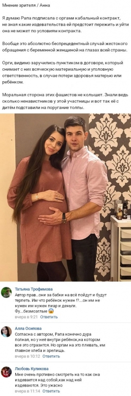 Фанаты искренне удивляются тому, что женщина без возражений переносит абсолютно все обиды и неприкрытые оскорбления, не пытаясь оставить реалити-шоу или, во всяком случае, выдвинуть определенные условия хотя бы в отношении ее семьи и ожидаемого младенца.
