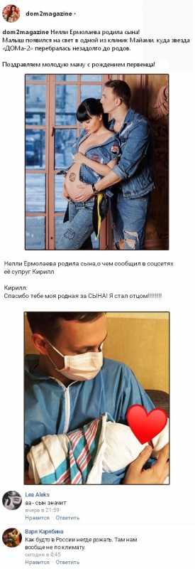 Несколько недель назад Ермолаева и ее супруг отправились в Майами, где они дожидались рождения малыша в одной из местных клиник. Накануне выяснилось, что эти двое уже обрели статус родителей. Приятным известием поделился с поклонниками новоиспеченный отец, от души поблагодарив жену за появившегося у него сынишку. Однако пара пока никому не сообщила о том, каким ростом и весом обладает младенец, а также о том, какое имя ему собираются дать Нелли и Кирилл.