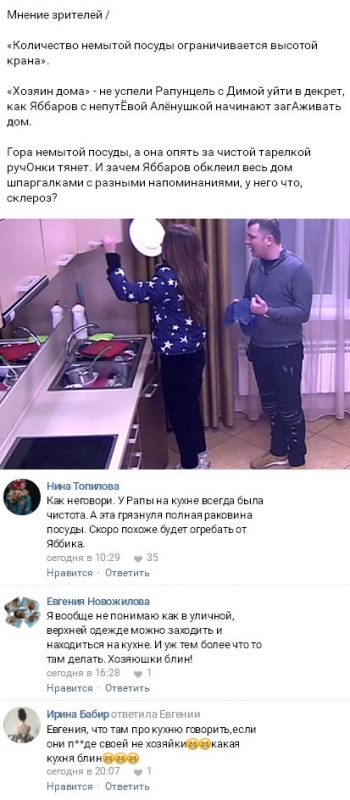 18 февраля 2018 года выяснилось, что дом Ольги Рапунцель стал более всего напоминать настоящую свалку, едва молодая женщина успела уйти в декретный отпуск. Хотя многие поклонники телестройки относятся к Ольге с откровенной неприязнью, а сама будущая мать иногда ведет себя явно неадекватно, фанаты телепроекта всегда замечали и продолжают обращать внимание на то, насколько Рапунцель любит чистоту и порядок. Даже находясь в «интересном положении», женщина не забывала об уборке вип-жилища, хотя среди ее соседей нередко оказывались отнюдь не самые аккуратные и чистоплотные обитатели периметра. Смотрите также: дневной вечерний и ночной выпуск дом 2 Именно по этой причине большинство телезрителей искренне возмутились, увидев, что сестра Ольги Алена Савкина буквально за несколько часов сделала из вип-дома подлинную помойку. Поклонники телестройки сразу увидели, что девушка и Илья Яббаров теперь перемещаются по комнатам только в уличной обуви. К тому же Савкина вовсе не торопится избавляться от грязи или хотя бы мыть собственную посуду. Во всяком случае, готовясь к ужину с возлюбленным, Алена оставила целую гору использованной посуды в раковине, взяв с полки чистую тарелку. При этом Илья, который охотно составил жесткие правила для пары Дмитрия Дмитренко и Ольги Рапунцель, даже не попытался в чем-либо упрекнуть подругу. Впечатление от снимка и мнение о том, действительно ли Алена Савкина, в отличие от сестры, является крайне неаккуратным и даже неряшливым человеком, вы можете высказать в комментариях.