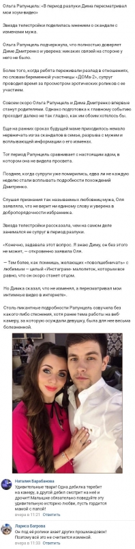 Но сама Оля не слишком верит в такую возможность. В интервью проектному журналу она без стеснения рассказала о том, что полноценную физическую близость Дмитренко вполне заменяли видеоролики с ее участием, которые он сознательно отыскал на просторах Интернета. Хотя сама молодая женщина сочла подобную ситуацию абсолютно нормальной, многие были буквально потрясены и ее бесцеремонной откровенностью, и явно извращенным воображением Дмитрия. Фанаты этой семьи пришли к выводу, что для Рапунцель было бы гораздо предпочтительнее промолчать, чем выдавать столь неприкрытый позор миллионам людей.