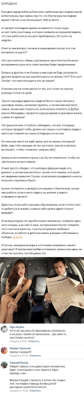 Вышедшая из себя Бородина жестко пристыдила таких девушек и призвала подписчиц ни в коем случае не идти таким путем. По словам Ксении, работницы отрасли эскорта, или, иначе говоря, обычные проститутки никогда не сумеют в дальнейшем стать счастливыми, ведь дома их ожидают унылые вечера в одиночестве, а вовсе не любящая семья, дети и супруг.