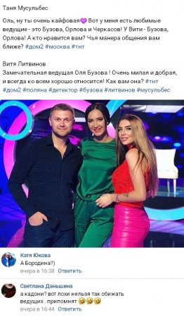Но выяснилось, что Татьяна Мусульбес считает совершенно иначе. На своей страничке в социальной сети Инстаграм Таня без стеснения призналась, что ей чрезвычайно нравится Бузова, и она видит лучшую телеведущую как раз в Ольге. К тому же Мусульбес не отрицает и своих симпатий к Андрею Черкасову и Ольге Орловой.