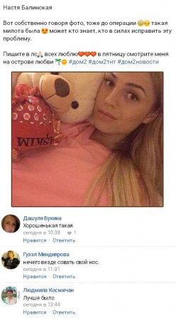 22 февраля 2018 года Анастасия Балинская разместила в Интернете фотоснимок, на котором девушка кажется необыкновенно привлекательной. Совсем недавно Настя, окончательно утратив терпение из-за насмешек и критических замечаний окружающих по поводу ее внешности, все же решилась рассказать, по каким причинам она сейчас выглядит не самым лучшим образом. По словам Балинской, ранее она являлась если и не настоящей красавицей, то весьма симпатичной молодой женщиной, однако неудачно сделанная ринопластическая операция имела для нее самые печальные последствия. Смотрите также: дом 2 25 февраля 2018 Стоит обратить внимание, что утверждению Анастасии предпочли поверить отнюдь не все поклонники реалити-шоу, а недоброжелатели снова поспешили сравнить ее с другим участником телепрограммы, который, правда, уже давно оставил телестройку, речь идет о Гогене Солнцеве. К тому же на фотографиях, сделанных как до, так и после ринопластики Балинская выглядит фактически одинаково, изменения связаны лишь с кончиком носа девушки. Но снимок трехлетней давности, который охотно продемонстрировала подписчикам Настя, все же убедил многих в правдивости ее высказываний. Исходя из этого снимка, прежде она действительно была по-настоящему красивой. Если бы не ее необдуманное решение переделать природную форму собственного носа, Анастасия бы наверняка пользовалась сейчас огромным успехом у представителей противоположного пола. Впечатление от фотографии и мнение о том, действительно ли Анастасия Балинская совершила серьезную ошибку, вознамерившись сделать ринопластическую операцию, вы можете изложить в комментариях.