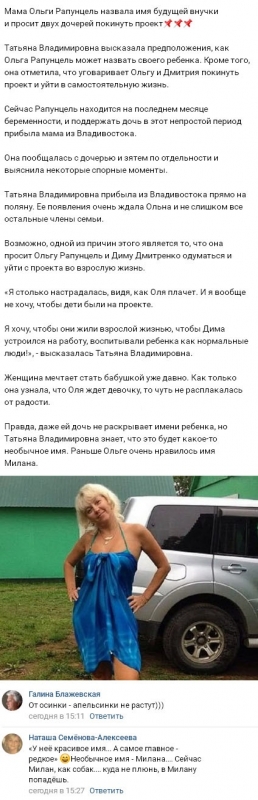 25 февраля 2018 года мать беременной Ольги Рапунцель сообщила общественности имя, которое планируется дать ее пока не появившейся на свет внучке. В отличие от многих коллег по периметру, которые охотно делились с окружающими всеми подробностями аналогичного положения, Ольга вовсе не торопится раскрывать детали, касающиеся ее состояния, и с крайним нежеланием демонстрирует результаты УЗИ. Дата ожидаемых родов также стала известной фанатам реалити-шоу совсем недавно. Смотрите также: дом 2 вечерний выпуск за 28.02.2018 При этом имя дочери, которое Рапунцель и ее супруг Дмитрий Дмитренко выбрали для девочки с подлинной любовью и искренней заботой, будущая мама намеревалась раскрыть только после прибытия на проект по завершении декретного отпуска. По словам Ольги, ее беспокоит возможное влияние недоброжелателей и то, что они действительно способны причинить вред ребенку. Но все тайное в определенный момент выясняется. В случае с Рапунцель это произошло существенно раньше, чем планировала сама женщина. Татьяна Владимировна Григорьевская, видимо, абсолютно случайно проговорилась в виртуальном пространстве относительно имени внучки. Как утверждает солидная дама, которая в самое ближайшее время станет бабушкой, Ольга всегда с симпатией относилась к имени Милана и, скорее всего, именно так и будет названа девочка. Свое мнение о том, подходящее ли имя для будущей малышки подобрала Ольга Рапунцель, вы можете изложить в комментариях.