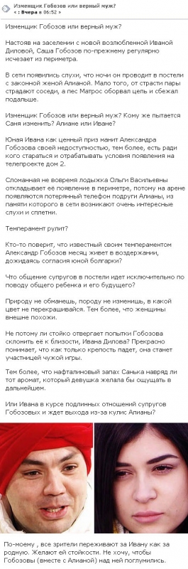 Однако Ивана нисколько не спешит ни с совместным заселением с Сашей, ни с интимными контактами, о которых мечтает Александр. Более того, исходя из недавних событий и явных колебаний девушки, их отношения с Гобозовым уже находятся на грани полного разрыва. Всем ясно, что Дилова отнюдь не случайно изображает недотрогу. Проблема заключается не только в том, что Гобозов уже разочаровал Ивану.
