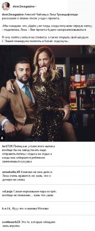 В то же время сами Алексей и Елизавета, как оказалось, вполне ожидали подобного поворота событий. Более того, Триандафилиди и Чайчиц усиленно готовились к разрыву с телешоу уже с момента получения черной метки от Андрея Черкасова. Правда, оба абсолютно не переживают и не расстраиваются из-за ухода с телепрограммы.