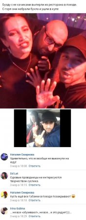 По словам очевидцев, женщина устроила отвратительный концерт в поезде в ходе переезда в один из городов. Слишком злоупотребившая алкогольными напитками знаменитость стала вести себя при пребывании в вагоне-ресторане столь беспардонно и вызывающе, что Бузову просто пришлось выставить оттуда в ее купе, куда она и отправилась вместе со своей командой, причем ее состояние нельзя было назвать адекватным из-за большого количества спиртного.