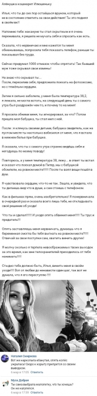 9 марта 2018 года Алена Ашмарина не стала более скрывать от окружающих то, насколько отвратительно повел себя Илья Григоренко по отношению к ней. Совсем недавно Алена по-настоящему удивила своих поклонников известием о том, что она готовится к рождению ребенка. В то же время молодая женщина сообщила и о разрыве с бойфрендом, который, по ее словам, просто не сумел справиться со страхом из-за перспективы предстоящего вскоре отцовства. Но уже через несколько дней эти двое вновь помирились, и Ашмарина охотно продемонстрировала подписчикам весьма симпатичную семейную фотографию. Смотрите также: дом 2 за 12 марта ночной эфир Но положительный период в жизни беременной экс-участницы телестройки продолжался недолго. Всем уже известно о том, что Илья опять отправился в Санкт-Петербург, причем парень подчеркнул, что виновата в их расставании именно Алена, которая просто выставила его прочь без всякого повода со стороны Григоренко. В то же время Ашмарина утверждает, что Илья отнюдь не говорит всей правды, излагая собственную версию случившегося. Алена не отрицает, что она начала сомневаться в верности возлюбленного, поскольку на протяжении последних суток юноша явно нервничал и всячески прятал от подруги свой телефон. Более того, как утверждает будущая мама, именно Григоренко решил с нею распрощаться, а бабушка Ашмариной оказалась свидетелем безобразного поведения Ильи в момент его ухода. Свое мнение о подлинных причинах разрыва пары Алены Ашмариной и Ильи Григоренко и о том, способны ли эти двое в дальнейшем возобновить отношения, вы можете изложить в комментариях.