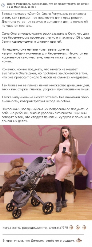 12 марта 2018 года ожидающая младенца Ольга Рапунцель призналась поклонникам в том, что утратила сон по ночам. Первый ребенок Ольги и ее супруга Дмитрия Дмитренко должен родиться в самое ближайшее время. Будущие мать и отец старательно готовятся к намеченным родам. При этом Рапунцель не забывает баловать себя активным шопингом и нисколько не скрывает того, что готова охотно приобретать для дочери множество новых и красивых нарядов. Смотрите также: дом 2 15 марта 2018 дневной Правда, на протяжении последних дней Оля все чаще жалуется на то, что у нее возникли проблемы со сном. Выяснилось, что по ночам молодая женщина почти не спит и не может себе позволить хотя бы ненадолго прилечь днем в связи с крайне плотным и напряженным графиком. Кроме съемок на телешоу на протяжении 5 часов Рапунцель вынуждена всерьез заниматься и многочисленными домашними делами, в частности, стиркой, приготовлением еды, уборкой. Хотя сама будущая мама нисколько не утрачивает присутствия духа, фанаты по-настоящему за нее беспокоятся. Они призывают Ольгу подумать о себе и малышке и хотя бы часть обязанностей по дому переложить на Дмитрия. Свое мнение о том, действительно ли Ольге Рапунцель следует в данный период времени больше беречь собственное здоровье, вы можете высказать в комментариях.