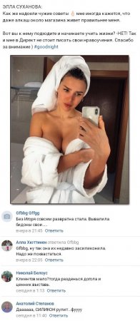 Но имеются и те, кто поторопился выступить на стороне Эллы. Преданные приверженцы девушки полагают, что со столь прекрасными формами она имеет право и на размещение подобных фотоснимков. К тому же теперь Суханова не связана супружескими узами и, судя по всему, уже вполне готова к построению новых взаимоотношений.