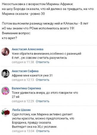Во время одного из последних ток-шоу истинный возраст участницы телешоу открыла окружающим Бородина. Хотя сама Марина утверждала, что ей лишь недавно минуло 30, Ксения объявила, что в реальности Африкантовой существенно больше данного количества лет, и лгать в соответствующем отношении для нее не имеет никакого смысла.