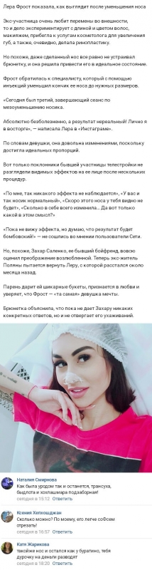 А совсем недавно Фрост показала всем результаты, которые принесли сеансы, пройденные ею для того чтобы сделать себе иной нос посредством мезоуменьшения. По словам Валерии, оказалось достаточно лишь трех процедур для того, чтобы ее нос все же стал ей по-настоящему нравиться и выглядеть именно так, как хочется ей самой.