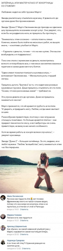 28 марта 2018 года достоянием общественности оказались весьма пикантные подробности прежней работы Маргариты Овсянниковой в эскорт-сервисе. Невзирая на многочисленные сплетни по этому поводу и даже существование доказательств в виде фотографий, сама Марго до последней возможности стремилась отрицать факт своей занятости в эскорте до прихода на реалити-шоу. К тому же она даже сумела обмануть полиграф. Однако именно после этого события Овсянникова все же решилась открыть окружающим правду, не скрывая никаких, даже самых неприглядных деталей. Смотрите также: дом 2 31 марта 2018 дневной Откровенность обошлась девушке крайне дорого. В результате даже завершились ее взаимоотношения с Саймоном Марданшиным, парень не сумел простить ей столь непристойного поведения. Но теперь, когда все наиболее неприятные моменты уже остались в прошлом, Маргарита довольно охотно делится соответствующими сведениями. В частности, в ходе одного из последних интервью девушка не стала скрывать пристрастий своих клиентов в интимной сфере. При этом Овсянникова не пожелала утаить и того, что ей и самой нравятся нестандартные формы сексуальных контактов. К числу наиболее существенных предпочтений участницы телешоу относятся плетки и разнообразные игрушки аналогичного характера. Оказалось, что Марго вполне способна и на то, чтобы применить рукоприкладство или немного придушить партнера во время близости. Свое мнение об откровенных признаниях Маргариты Овсянниковой вы можете изложить в комментариях.