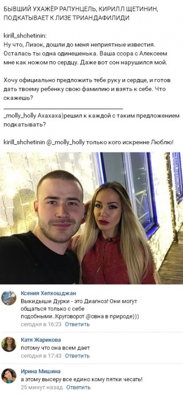 11 апреля 2018 года выяснилось, что прежний поклонник Ольги Рапунцель сделал Елизавете Триандафилиди весьма привлекательное предложение. Всем уже известно о том, что Лиза и ее бойфренд Алексей Чайчиц приняли решение расстаться. Правда, сами бывшие обитатели периметра пока не сообщают никакой дополнительной информации по этому поводу, но ни один из них не скрывает явного разочарования в партнере. Но если у Чайчица пока не имеется определенных перспектив на удачное устройство личной жизни и создание семьи, то Триандафилиди в самое ближайшее время вполне может выйти замуж. Смотрите также: дом 14.04.2018 Посетители социальных сетей сделали такой вывод после того, как Кирилл Щетинин, которого телезрители запомнили благодаря его роману с Рапунцель, официально предложил Елизавете руку и сердце. При этом Кирилл не только намеревается жениться на Лизе, но и полностью готов взяться за воспитание ее дочери от первого брака. Однако почти никто не верит в то, что Щетинин действительно неравнодушен к бывшей подруге Алексея Чайчица и искренне стремится стать ее мужем. Большинство фанатов телестройки нисколько не сомневаются в том, что Кирилл лишь пытается сделать себе пиар, используя разрыв Леши и Лизы. Если бы эти двое не распрощались, молодой человек едва ли вспомнил бы о Триандафилиди. Свое мнение о том, действительно ли Кирилл Щетинин выразил намерение жениться на Елизавете Триандафилиди только ради собственной популярности, вы можете изложить в комментариях.