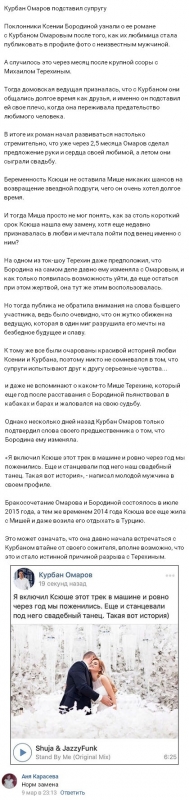 Теперь факт неверности со стороны Бородиной счел возможным подтвердить и сам Омаров. На своей страничке в социальной сети Инстаграм Курбан разместил трогательную композицию, упомянув о том, что когда-то они с Ксенией слушали ее, находясь в автомобиле. Тогда мужчина даже не представлял себе, что по прошествии года он станет законной «второй половинкой» этой женщины. Учитывая то, что Омаров и Бородина вознамерились пожениться в июле 2015 года, а за год до этого момента Ксения еще проживала совместно с Терехиным, не остается сомнений в том, что телеведущая достаточно долго изменяла экс-бойфренду.