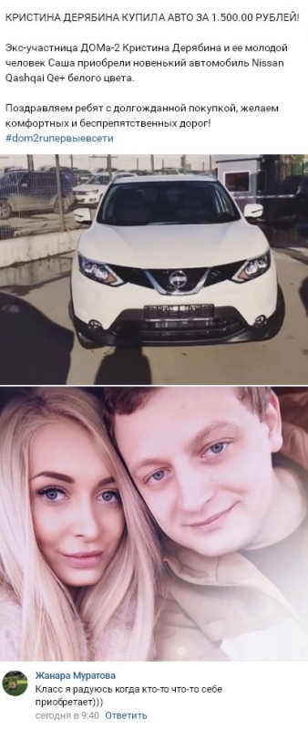 13 апреля 2018 года стало известно о том, что бывшей участнице телестройки Кристине Дерябиной удалось приобрести новую автомашину, стоимость которой составила не менее 1,5 миллиона рублей. Совсем недавно Кристина выражала откровенное недовольство из-за отсутствия личного транспортного средства. Девушка не скрывала того, что она вынуждена пользоваться автомобилем своего друга, тогда как молодому человеку приходится передвигаться с помощью метро. Смотрите также: дом 2 16 апреля 2018 Но теперь все соответствующие трудности прежней обитательницы периметра и ее возлюбленного Александра остались в прошлом. Выяснилось, что эта пара купила новый белый Nissan Qashqai Qe , причем желанная машина обошлась им в 1,5 миллиона рублей. Правда, еще неизвестно, кто именно из этих двоих будет в дальнейшем находиться за рулем автомобиля. Стоит обратить внимание на то, что в последнее время влюбленные приобрели для себя не только превосходную машину. Совсем недавно Александр получил в собственность и жилплощадь в Москве. Теперь в течение нескольких лет мужчине придется выплачивать ипотечный кредит. Впечатление от снимка и мнение о том, рады ли вы за Кристину Дерябину и ее бойфренда в связи с совершенной ими значительной покупкой, вы можете высказать в комментариях.