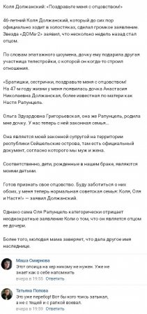 19 апреля 2018 года человек, являвшийся в прошлом обитателем периметра, решил выступить в качестве конкурента Дмитрия Дмитренко и признать новорожденную дочь Ольги Рапунцель своей. Многие прекрасно помнят о свадьбе на Острове любви, которую сыграли Оля и Николай Должанский. При этом сам мужчина все еще полагает, что их брак является официальным в соответствии с российским законодательством. По этой причине Коля, основываясь на последних событиях в жизни Рапунцель, претендует не только на нее, но и на малышку. Смотрите также: дом 2 22.04.2018 вечерний На своей страничке в социальной сети Инстаграм Должанский сообщил подписчикам приятную новость и попросил всех поздравить его с отцовством. Как утверждает сам Николай, возраст которого приближается к 47 годам, он стал папой крохотной Насти Рапунцель. В особенности мужчина подчеркнул то, что теперь созданная им и Ольгой семья, наконец, является настоящей и полноценной. При этом Должанский не отрицает того, что биологическим отцом малышке приходится вовсе не он. Но в связи с тем, что его брак с Рапунцель все еще не расторгнут, он намеревается считать своим любого ребенка, который родится у Оли. Свое мнение о высказываниях Николая Должанского относительно Ольги Рапунцель и ее дочери вы можете изложить в комментариях.