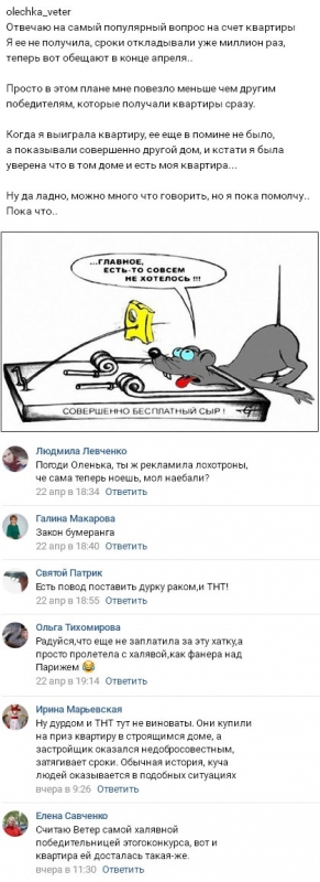 Нет ничего удивительного в том, что подписчики не перестают расспрашивать Ветер относительно полученного ею приза. Однако Ольга не в состоянии ничем порадовать людей, которые действительно тревожатся о ее судьбе. Как утверждает бывшая участница телепроекта, она уже просто устала дожидаться обещанной ей квартиры, поскольку сроки заселения вновь и вновь откладываются с каждым последующим месяцем. Исходя из последней имеющейся информации, Ветер должна переехать в свое жилище уже в конце апреля.