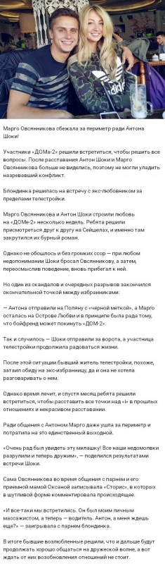 23 апреля 2018 года стало известно о том, что Маргарита Овсянникова решилась совершить побег из периметра, намереваясь встретиться с прежним возлюбленным. Взаимоотношения между Марго и Антоном Шоки никогда не были безоблачными. Горячие ночные объятия и пылкие признания в искренних чувствах сменялись громкими скандалами и весьма некрасивыми конфликтами. В результате одной из ссор Шоки и Овсянникова приняли решение распрощаться, после чего Антон вернулся на Поляну и почти немедленно оставил телестройку, тогда как Маргарита охотно продолжила проводить время под наблюдением камер. Смотрите также: дом 2 дневной эфир 27.04.18 Но в итоге эти двое все же вознамерились встретиться еще раз, чтобы окончательно выяснить все вопросы. Ради того чтобы пообщаться с бывшим бойфрендом Марго даже покинула пределы телешоу. Однако воссоединения, о котором мечтали приверженцы данной пары, так и не состоялось. Хотя Овсянникова и Шоки погасили все взаимные претензии и недоразумения и заключили перемирие, между ними более не идет речи о настоящей любви. По словам самой Маргариты, Антон теперь вполне может быть для нее другом, но более тесные отношения с ним для нее уже неприемлемы. Девушка не стала скрывать и того, что сохраняет надежду встретить подлинного избранника на телепрограмме. Но, наблюдая за общением Овсянниковой и Шоки в сториз, нетрудно понять, что молодые люди все еще небезразличны друг к другу. К тому же Марго однозначно не против флирта с этим парнем. Впечатление от снимка и мнение о том, могут ли Маргарита Овсянникова и Антон Шоки снова стать парой, вы можете высказать в комментариях.