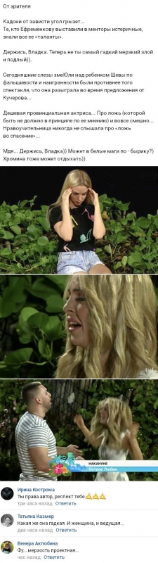 Многие потрясенно наблюдают за тем, как Ефременкова фактически издевается над подопечными. Хотя телеведущая и старается изобразить, будто сопереживает их проблемам, в это чрезвычайно сложно поверить. На фоне молодой женщины даже Влад выглядит более терпимым и мягким ведущим. Однако его принимали на работу именно на роль самого беспощадного и сурового телеведущего, поэтому теперь возможно, что руководство телешоу сочтет более не нужным присутствие Кадони в эфирах и уволит мужчину с занимаемой должности.