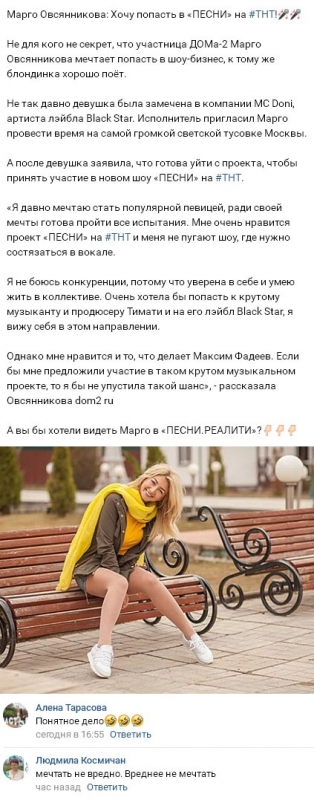 Свое мнение о том, следует ли Маргарите Овсянниковой пытаться таким образом сделать карьеру на телевизионном канале ТНТ, вы можете высказать в комментариях.
