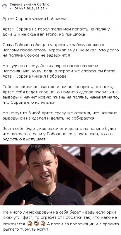 Хотя сам Саша комментировал собственное бездействие тем, что Артем якобы изменился и более не позволяет себе столь некрасивого поведения, сам Сорока немедленно объяснил окружающим, как обстоят дела в реальности. Выяснилось, что юноша вовсе не собирался вести себя таким образом, как этого желал бы Гобозов. К тому же Артем отнюдь не сделал и не планировал делать каких-либо выводов относительно прежних ситуаций. Парень в особенности подчеркнул то, что он охотно снова выслушает обвинения Гобозова по своему адресу. Однако теперь сам Александр не торопится выдвигать никаких претензий к Сороке.