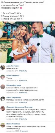 6 мая 2018 года выяснилось, какая из трех проектных пар, претендующих на первое место в состязании «Свадьба на миллион», победила в этом конкурсе. В течение нескольких месяцев пары участников телешоу ожесточенно сражались между собой за право получить главный приз и в дальнейшем устроить шикарную свадьбу. Правда, фавориты в данном соревновании были определены фактически сразу же. Большинство из поклонников телестройки нисколько не сомневались в том, что на первом месте окажутся Роман Капаклы и Марина Африкантова особенно после того как из числа конкурентов были удалены Алексей Купин и Майя Донцова. Но в итоге победа досталась совершенно иной паре. Оказалось, что вперед все же сумели вырваться Виктор Литвинов и Татьяна Мусульбес. Хотя и с незначительным преимуществом, но эти двое перехватили первенство у Африкантовой и Капаклы, получив 53,41% голосов. Теперь Таня и Витя не только охотно принимают горячие поздравления от своих фанатов, но уже и обдумывают будущее роскошное бракосочетание. Свое мнение о том, рады ли вы победе пары Татьяны Мусульбес и Виктора Литвинова в конкурсе «Свадьба на миллион», вы можете высказать в комментариях.