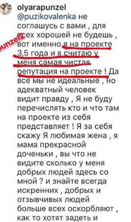 Поводом для тревоги окружающих за Олю стало ее новое громкое заявление. Поклонники телестройки прекрасно помнят о том, чем она ранее занималась в чате, предназначенном исключительно для взрослых пользователей, тогда как сама женщина уже обо всем забыла или делает вид, что ничего по этому поводу не помнит. Во всяком случае, сама Рапунцель полагает, что из всех участниц телепрограммы у нее наиболее незапятнанная и достойная репутация, хотя она пребывает на телепередаче уже свыше трех с половиной лет.