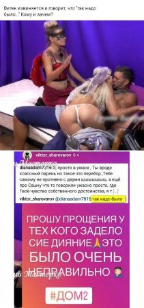 12 мая 2018 года Виктор Шароваров, который давно заслужил среди коллег по периметру и телезрителей репутацию отнюдь не самого умного и дальновидного человека, не сумел удержать в секрете то, что действительно происходило в одном из ночных эфиров. Фанаты реалити-шоу были искренне шокированы недавним проектным эфиром, транслируемым в ночные часы. Перед их глазами предстала подлинных групповых сексуальных контактов, устроенных непосредственно под наблюдением камер без всякого балдахина Дарьей Друзьяк, Еленой Хроминой и Виктором Шароваровым. Стоит обратить внимание, что это зрелище еще более настроило поклонников телестройки против этих троих. При этом некоторые, судя по всему, в первый раз по-настоящему пожалели Александру Шеву, которая до самого последнего момента не переставала верить в искренность чувств возлюбленного и буквально готова была отказаться ради него от общения с дочерью. Однако Виктор, которого, видимо, напугала резкая критика, прозвучавшая по адресу этого молодого человека, уже сумел найти оправдание. Пытаясь обелить собственную репутацию, Шароваров сообщил всем о том, что вовсе не желал делать подобных вещей и теперь от души раскаивается, но у него не было возможности поступить иначе, парню просто не было предоставлено никакого выбора. Правда, участник телепрограммы ничего не сказал именно об организаторах проекта, но у приверженцев телепередачи уже не осталось сомнений в том, что происходившее в ночном выпуске на самом деле было заранее запланировано в соответствующем сценарии. Свое мнение об откровениях Виктора Шароварова по поводу непристойных действий в эфире вы можете изложить в комментариях.