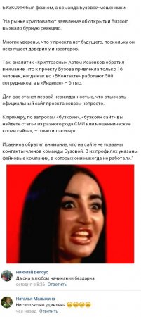 Удивление и тревогу вызывает также тот факт, что разыскать официальный ресурс, посвященный «бузкоину», оказалось весьма сложной задачей. По соответствующим запросам обнаруживаются лишь опубликованные в различных СМИ статьи указанной тематики или встречаются копии сайта, носящие однозначно мошеннический характер. К тому же на Интернет-портале нельзя найти ни единого контакта людей, работающих в команде телеведущей. В заполненных профилях названы компании, являющиеся несомненными фейками, где члены группы Бузовой стопроцентно никогда не работали.