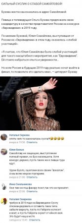 Ольга Бузова также решила принять участие в этой кампании. По словам телеведущей, она изначально нисколько не сомневалась в провале Юлии. Более того, Оля искренне удивляется тому, по какой причине Самойлову, которая слишком не уверена в собственных силах и однозначно не готова к столь крупномасштабному выступлению, все же допустили к участию в «Евровидении».