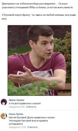 Однако намерение ведущих пригласить на телестройку мать Ильи Яббарова Людмилу Михайловну и старшую Григорьевскую заставило Олю и Диму окончательно потерять терпение и самообладание. Во всяком случае, Дмитренко был возмущен этим решением до такой степени, что не сдержал свой гнев даже в отношении Ольги Бузовой. Ясно, что Дмитрия абсолютно не привлекает перспектива обитать под одной крышей не только с младшей сестрой его жены Аленой Савкиной и ее бойфрендом Яббаровым, но и с двумя мамами, и он не сумел проконтролировать свои эмоции. Муж Ольги Рапунцель стал настаивать на том, чтобы Илья и Алена хотя бы зарегистрировали брак, а Бузовой он неприязненно заметил, что она готова устроить любую неразбериху ради организации шоу.