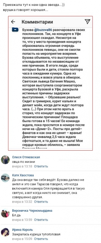 Уже на протяжении суток в виртуальном пространстве продолжается обсуждение беспардонного поведения телезвезды в Уфе. Как сообщила известная местная светская дама Евгения Машко, концерт Ольги задержался не менее чем на несколько часов, а сама Бузова без стеснения возложила вину за случившееся на организаторов. Хотя поклонники ожидали телеведущую на улицу в течение полутора часов, Оля спокойно отдыхала после очередных съемок, а затем достаточно долго курила кальян и наносила макияж.