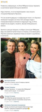 В чувства Риты к Яббарову с самого начала почти никто не верил. Однако многие не сомневаются, что у девушки действительно имеются серьезные планы по поводу карьеры в сфере шоу-бизнеса, и, соответственно, Ларченко не стала бы расставаться с телепрограммой, еще не добившись известности и славы.