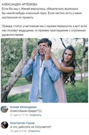 К тому же сама Артемова в одной из последних публикаций не стала отрицать, что она охотно стала бы снова появляться в эфирах. Александра нисколько не сомневается в том, что если бы она и Женя опять оказались на шоу, зрители бы встретили их с искренним восторгом, при этом они без труда выиграли бы и какой-либо достойный подарок в конкурсе.