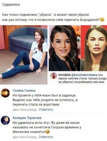 По поводу комментария одной из подписчиц, подробно рассказавшей о том, что позволяет себе говорить Сударкина в своих прямых эфирах, Бородина откровенно призналась в том, что подобное поведение со стороны Ольги ее нисколько не удивляет. Как утверждает Ксения, она вполне ожидала таких поступков от Сударкиной, которую телеведущая жестко назвала мразью. К тому же проектная ведущая отметила, что Оля стала столь смелой только после изгнания с шоу, тогда как ранее эта девушка готова была выполнить абсолютно все, чего от нее требовали руководители телестройки.