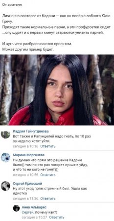 Фанатам телестройки искренне понравилось то, как Кадони изгнал с телевизионной передачи Романову, известную скорее под прозвищем «гречка». Едва молодая женщина слегка поморщилась, разглядывая профайл новичка, как Влад твердо решил не щадить подопечную. Когда Юлия пригрозила телеведущему, что охотнее расстанется с телепроектом, чем станет строить отношения с этим мужчиной, Кадони поддержал ее намерение уйти за ворота и не позволил остановить Романову ее товарищам по телестройке.