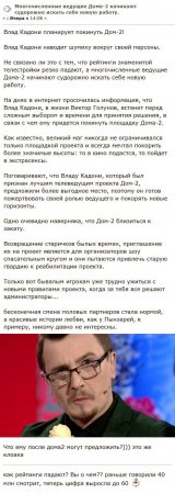 19 марта 2019 года поклонники телевизионного проекта, основываясь на замыслах телеведущего Влада Кадони, пришли к выводу о том, что на телестройке имеются чрезвычайно серьезные трудности. Названный молодой мужчина никогда не скрывал от окружающих, что стремится достичь в жизни большего, чем возможно с помощью телешоу. Видимо, у Влада действительно появилась подобная желанная возможность. В виртуальном пространстве распространяются сплетни о том, что Кадони, оказавшийся наиболее харизматичным и перспективным среди ведущих телестройки, получил весьма интересное и заманчивое предложение со стороны иного телевизионного канала. В связи с этим обстоятельством Влад в данный момент стоит перед чрезвычайно нелегким выбором. Правда, приверженцы телепрограммы считают, что колебания Кадони имеют непосредственное отношение к тому, что телепроект теперь находится далеко не в самом лучшем положении. Ни для кого не является тайной то обстоятельство, что рейтинги передачи быстро снижаются, в то время как опытные давние участники шоу, которых организаторы не перестают повторно приглашать в периметр, не в состоянии справиться с той миссией, которая на них возлагается руководством телестройки. Телезрители не исключают возможности того, что именно Влад первым убегает с «корабля», который рискует вскоре окончательно «затонуть». При этом стоит помнить и о том, что и Ксения Бородина планирует приступить к разработке авторской программы. В то же время не забыла обезопасить себя и Ольга Бузова, вплотную занявшись карьерой певицы.