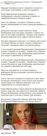 Однако с того момента, как начал проходить конкурс «Свадьба на миллион», отношения Безбородовой и Ефременковой стали еще более холодными и неприязненными, причем телезрители уже прекрасно понимают причину обострившегося противостояния девушек. Ни для кого не является секретом тот факт, что Милена, в отличие от соперников, не только чрезвычайно много говорит о достоинствах собственной пары с Алексеем Безусом, но крайне нелестно высказывается о тех, кто также участвует в названном состязании. К примеру, Безбородова уже не стала церемониться с Алексеем Купиным и Майей Донцовой, а затем она заметила, что не особо верит и в чувства Юлии Ефременковой к Мондезиру Свет-Амуру.