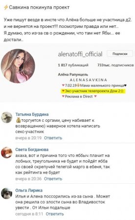 Но сейчас буквально вся Сеть потрясена тем, что выяснилось о Савкиной. В шапке профиля, имеющегося у Алены в социальной сети Инстаграм, молодая женщина указала, что она более не принадлежит к числу участников телестройки. Правда, Савкина не стала сообщать о том, как она планирует строить свою жизнь далее. Во всяком случае, еще неясно, стремится ли Алена оставаться в Москве либо желает вернуться на родину, во Владивосток, где у нее имеется жилье.