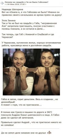 Однако подписчики все же нашли истинную причину поступка Андрея. Многие из них и сейчас помнят, что свадебное торжество Гобозова и Алианы Устиненко стало для Черкасова настоящим кошмаром. Устиненко на этом празднестве повела себя просто отвратительно, позволив себе даже облить Андрея шампанским. Более того, после случившегося Алиана резко запретила Черкасову даже заходить в банкетный зал.