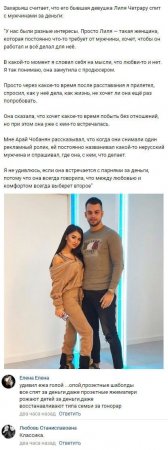 Более того, Захарьяш подчеркивает уверенность в том, что Лиля зарабатывает на жизнь оказанием эскорт-услуг. Выяснилось, что Четрару и в период их связи постоянно говорила о том, что безоговорочно предпочитает комфорт любым чувствам.
